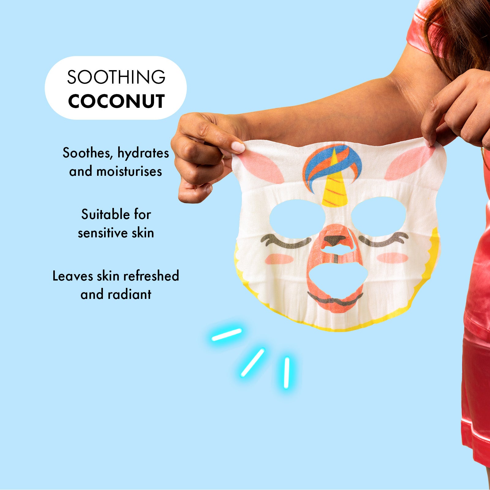 Your ticket to a little self-care with a playful twist! Introducing our moisturising and calming Llamacorn Face Mask, infused with Coconut and Papaya!