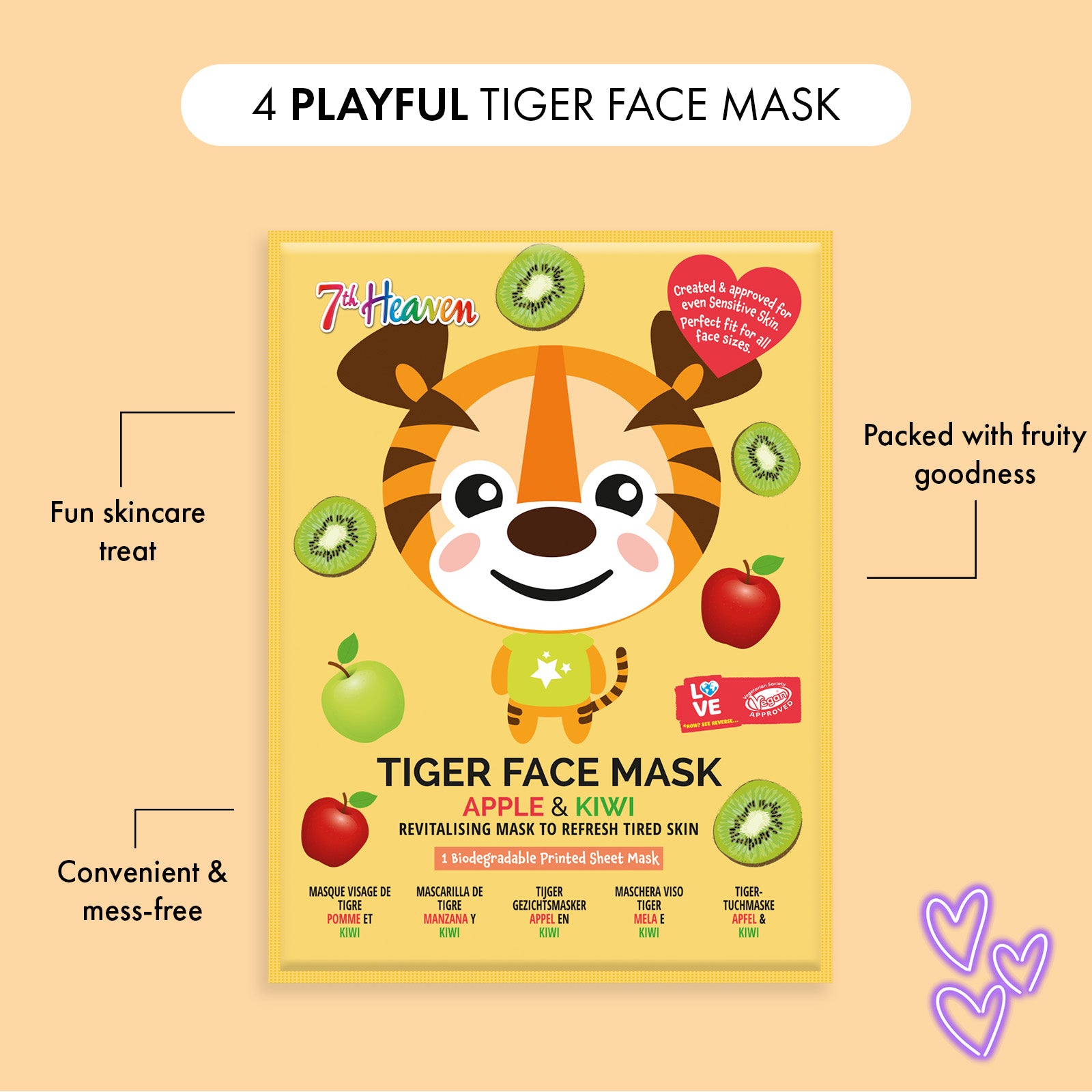 7th Heaven Tiger Sheet Face Mask with Apple & Kiwi - Revitalising & Brightening, Pack of 4