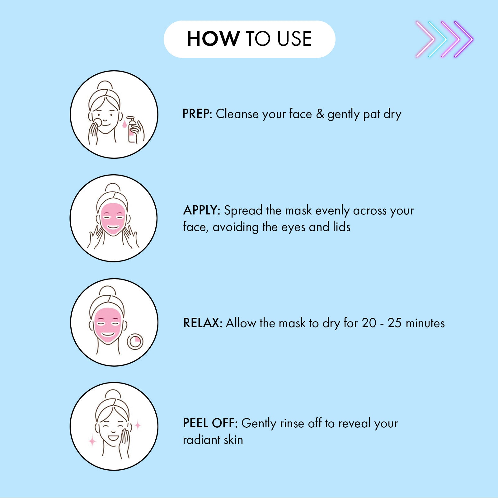 Most of our masks work their magic in 10 to 15 minutes. Always check the product label for exact timing and don’t forget to relax while it does its thing!